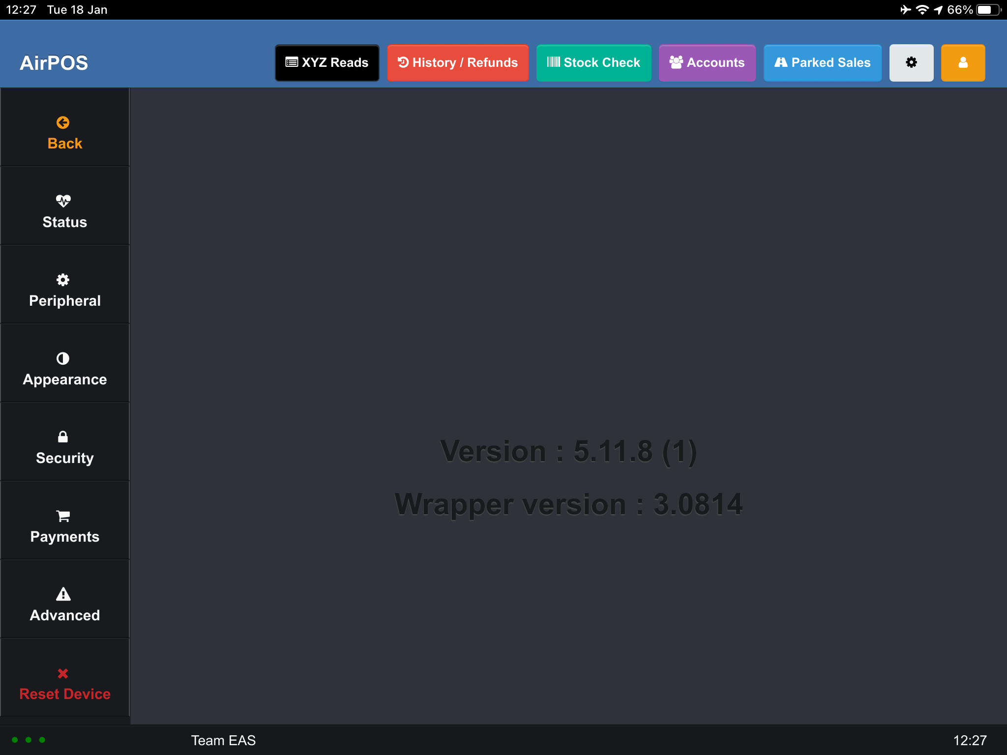 On the home settings page, which you can access by tapping on the settings cogwheel at the top of the POS screen, you will find the version number of AirPOS you are currently running.