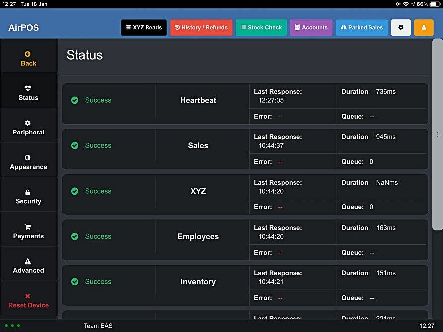 'Status' provides a quick visual display of the status for each aspect of your POS. 'Heartbeat' basically tells you that the device is online. Usually you should see 'Success' against 'Sales', 'XYZ', 'Employees', 'Inventory', 'Settings', and 'Parked Sales' indicating when each of these was successfully processed. Occasionally you'll see the word 'Processing' in amber beside one of these elements indicating that data is being updated as shown below.