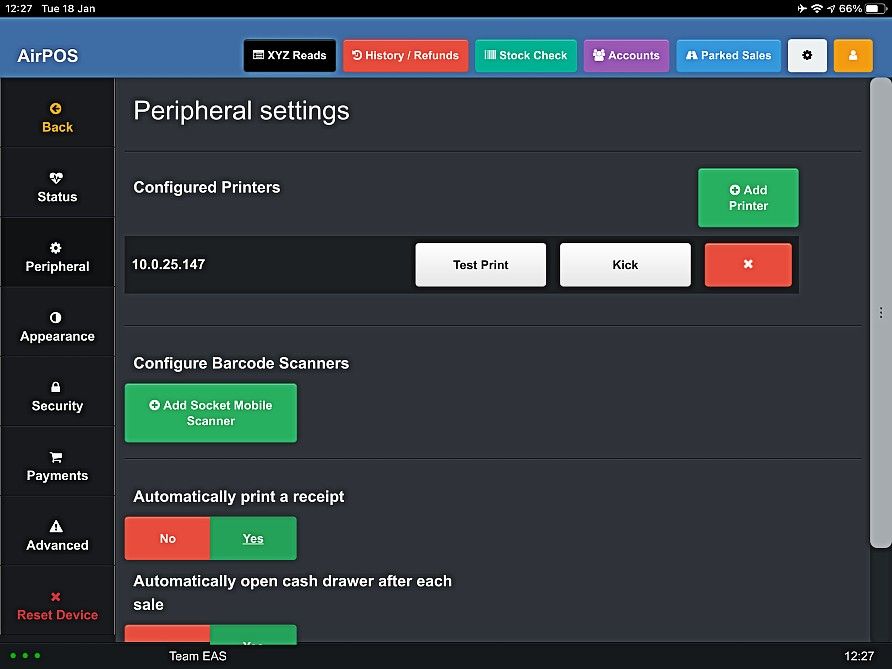 - If you want AirPOS to automatically print a receipt each time a sale is made, then make sure ‘Automatically Print Receipt’ is selected as ‘Yes’. If this is not checked, an operator can still produce a receipt by hitting ‘Print’ on the EPOS after a transaction.