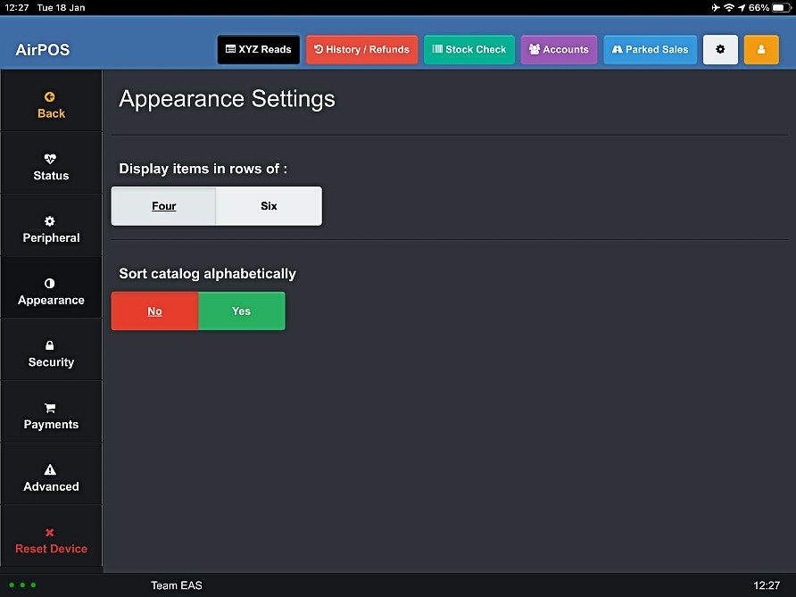 The ‘Appearance Settings’ button will give you the option to run AirPOS in full screen mode (Windows only), display items in rows of four or 6 items and sort categories alphabetically.