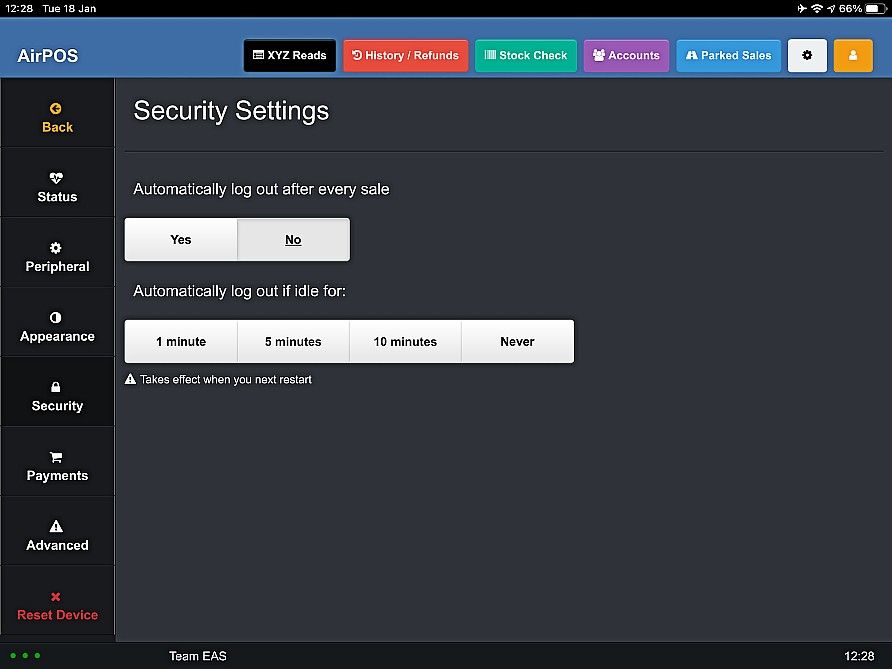 The ‘Security’ Settings will give you the option to automatically log out of AirPOS after one, five, ten minutes, never or after each transaction.