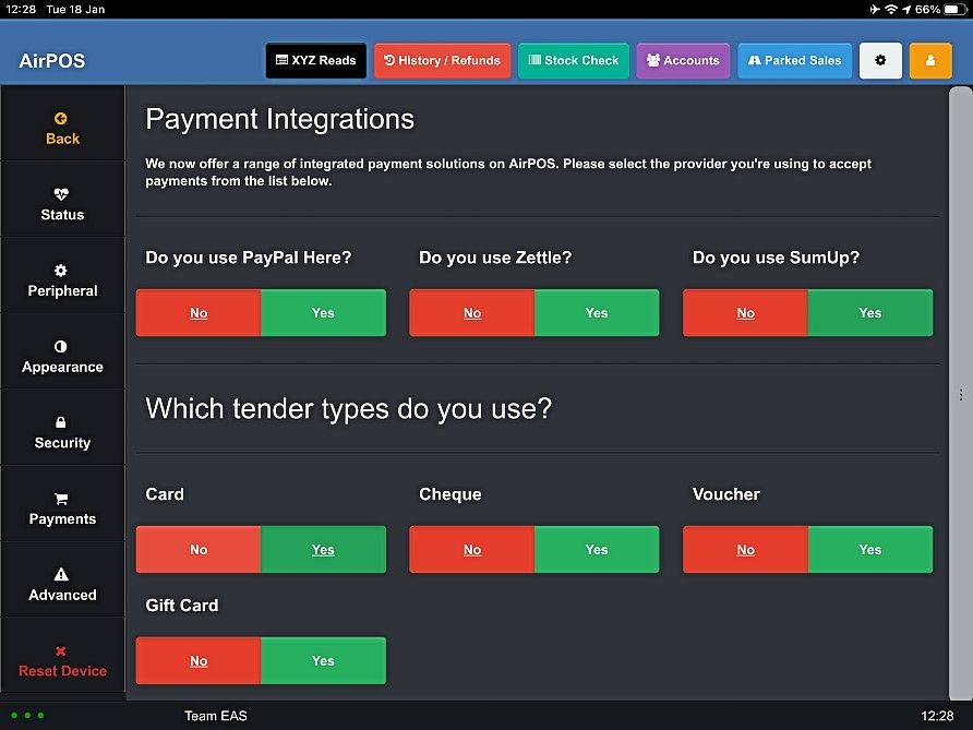 In this screen you can setup any payment integrations (PayPal Here, iZettle) that may be available and other tender types (card, cheque, gift card etc).