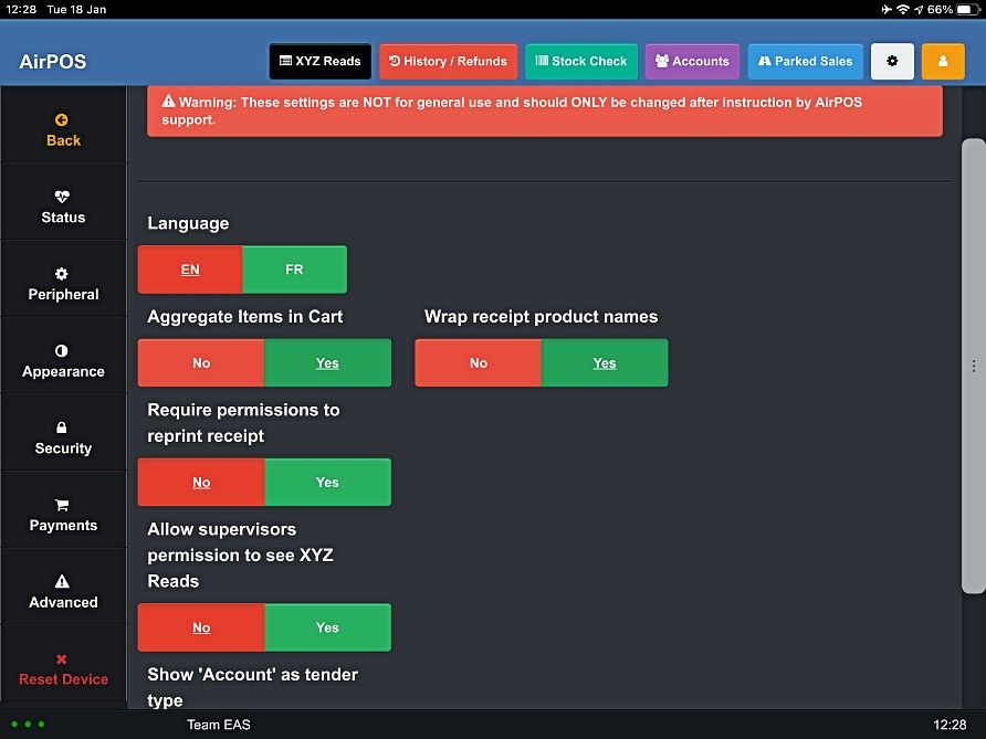 There is also the option in advanced settings to change the language from English to French. This will take effect when you next restart the application. You can apply a setting here that will require your staff to get an elevated PIN to reprint a receipt (this would be applicable where the receipt is an admission ticket). You can elevate a supervisors access to the 'XYZ Reads' in this screen if you so desire.
