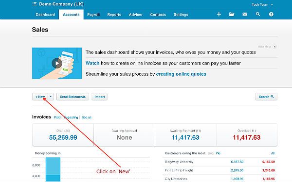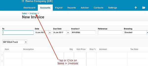 Click on 'Accounts' from the horizontal navigation panel at the top of the screen and from the dropdown list tap or click on 'Sales' and the screen will refresh and look like the image below.