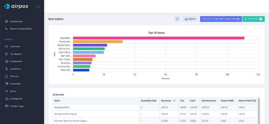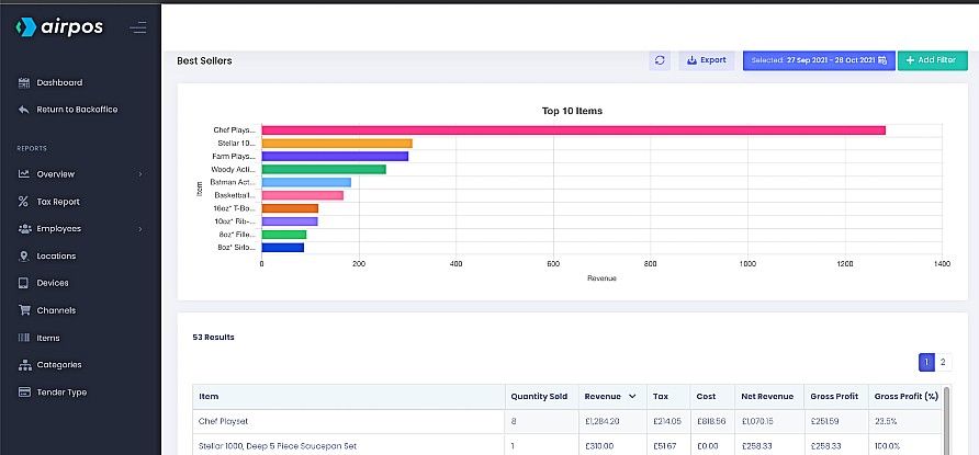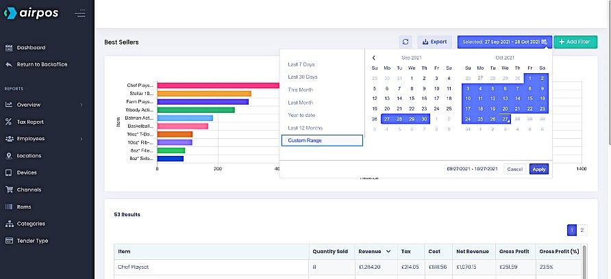 If you select 'Items' from the reports menu on the left you'll see a comparative bar chart of your top ten selling products. Below the bar chart is table of the sales of every product that you've sold within the date range at the top of the screen. This data can be exported to a.CSV file by pressing the 'Export' button beside the date range.