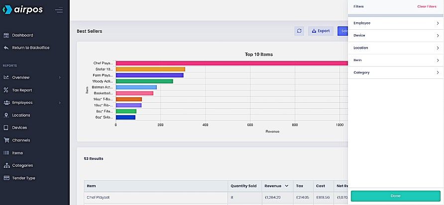 It may be that you want a report of your top selling products at one of your locations. This can be done by filtering the report. Tap on the green '+ Add Filter' button at the top of the screen. You'll see a dropdown list of filters.