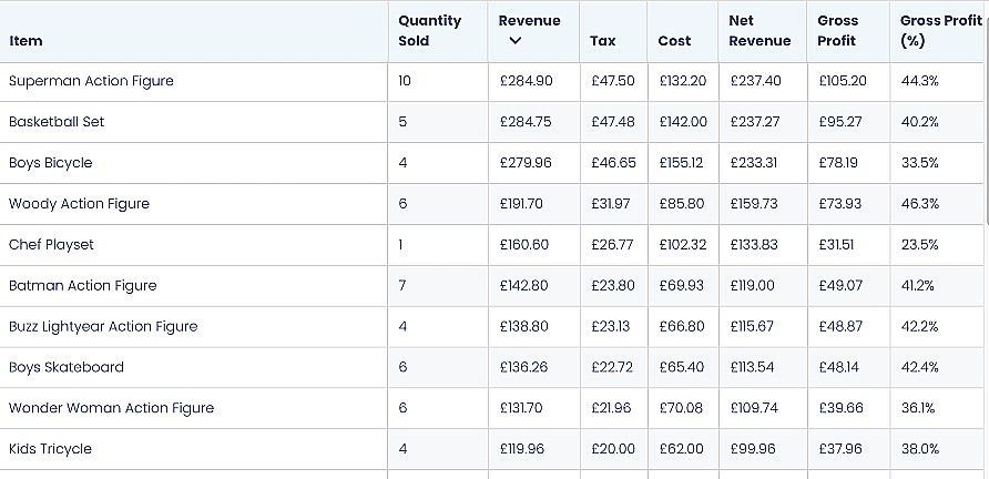 If we take the example of the Boys Bicycle above the 'Revenue' is the retail price multiplied by the quantity sold which is