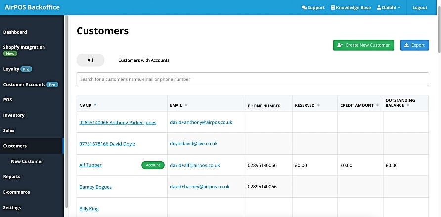 To link your new loyalty cards to your customer accounts, open up your AirPOS back office and select “Customers” from the navigation on the left-hand side of your screen. This will show you a list of all of your customers.