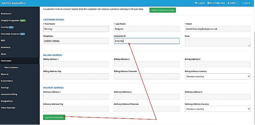 Copy the barcode number into the field of the selected customer account and click the green “update customer” button in the bottom left-hand corner of the screen in your backoffice.