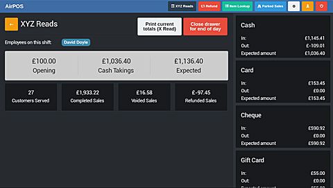 Z-Reads are generally performed at the end of each day. These provide a breakdown of tender types and transaction totals that have been performed on AirPOS, along with an expected cash amount that should be present in the drawer based on the cash takings plus the opening drawer amount. To carry out a ‘Z’ Read, when in the XYZ page, simply click ‘close drawer for end of day’ and enter your closing drawer amount, which is the amount of cash physically in the till.