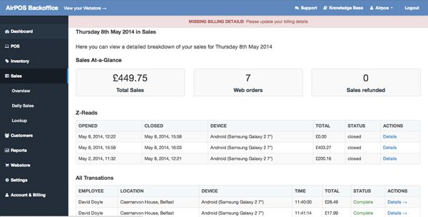 You can now view any Z read totals you’ve performed on the POS, directly from the AirPOS backoffice on your ‘Detailed Daily Sales’ screen as shown below;