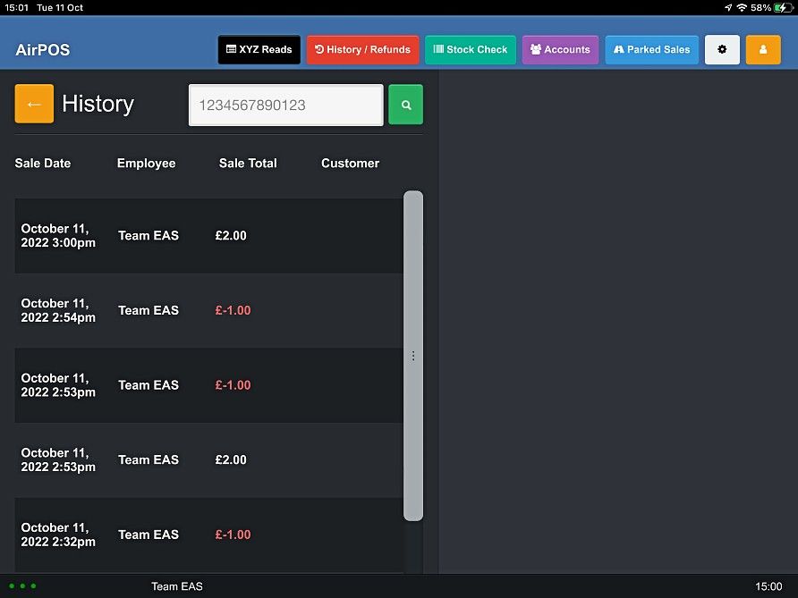 Refunding a transaction is done using the 'History / Refund' feature on the POS. When tapped 'History / Refund' will show all transactions made within the previous 24 hours. You can search for a specific transaction using the printed barcode off the sales receipt by entering the transaction number in the search box under 'History / Refund'.