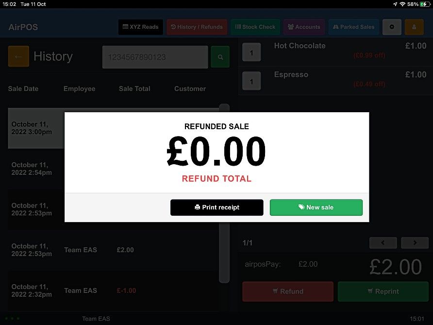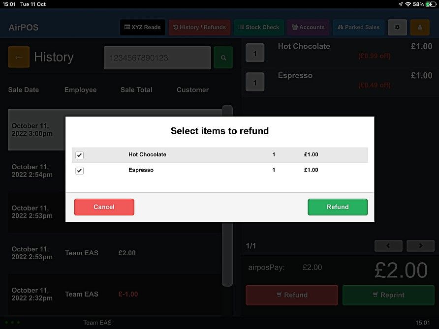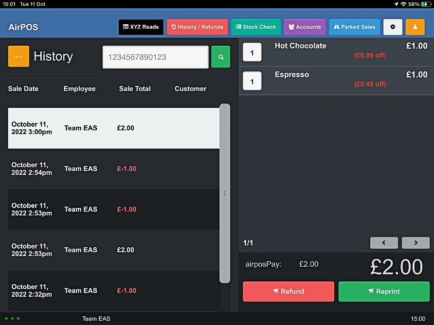When you have found the transaction tap on it and the cart will be populated with the items from the transaction with the options to reprint a receipt or refund the sale.