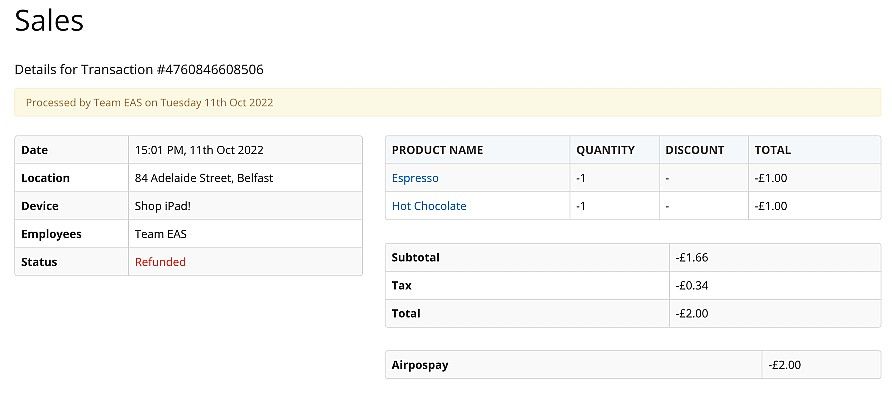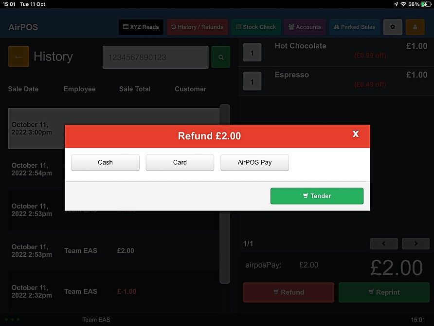 Please note - Refunds for the tender type 'AirPOS Pay' does not require the card the customer used for the purchase to be present. The refund will happen immediately after you select the tender type and press 'Refund'. Please be careful when assigning refunds or testing this feature.