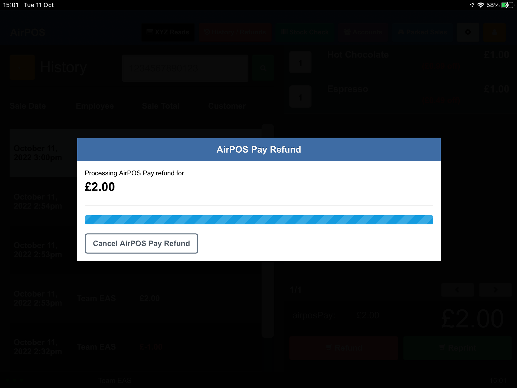 You'll see a popup to tell you that the refund is processing and after a few moments you will see the 'New Sale' popup to indicate that the refund is complete.