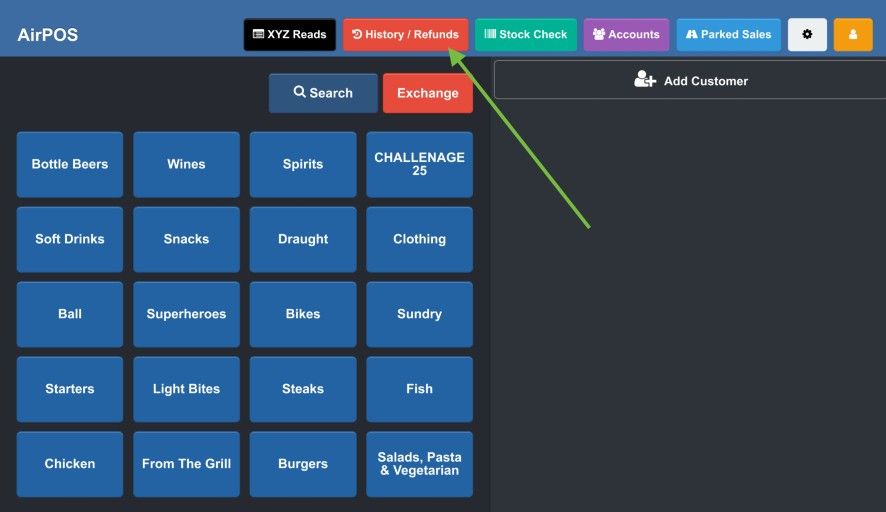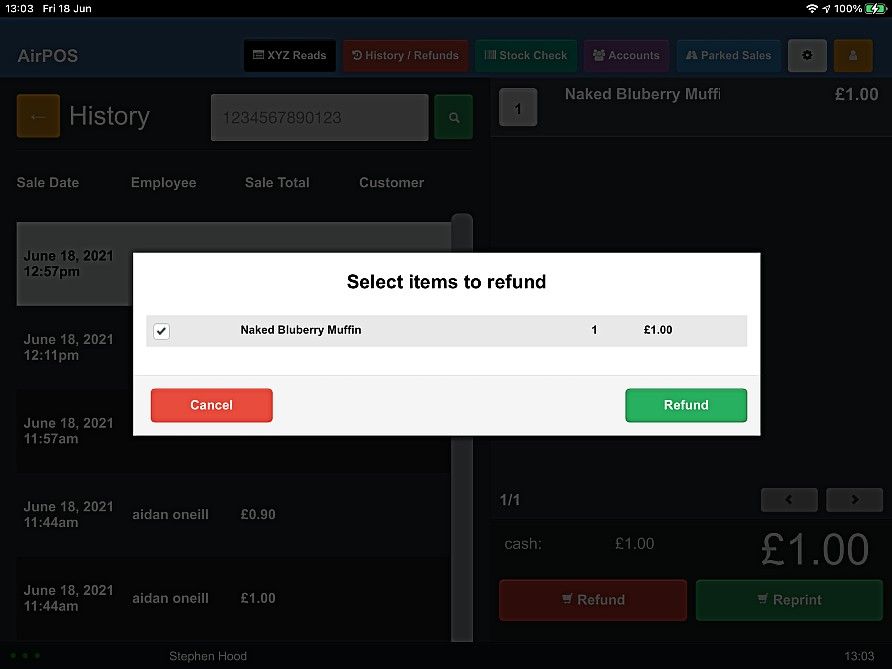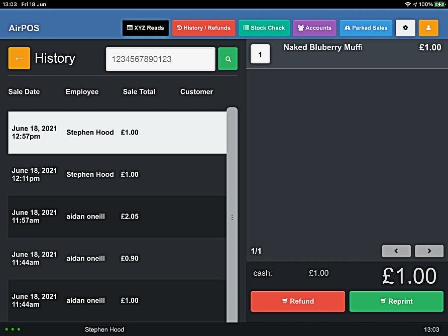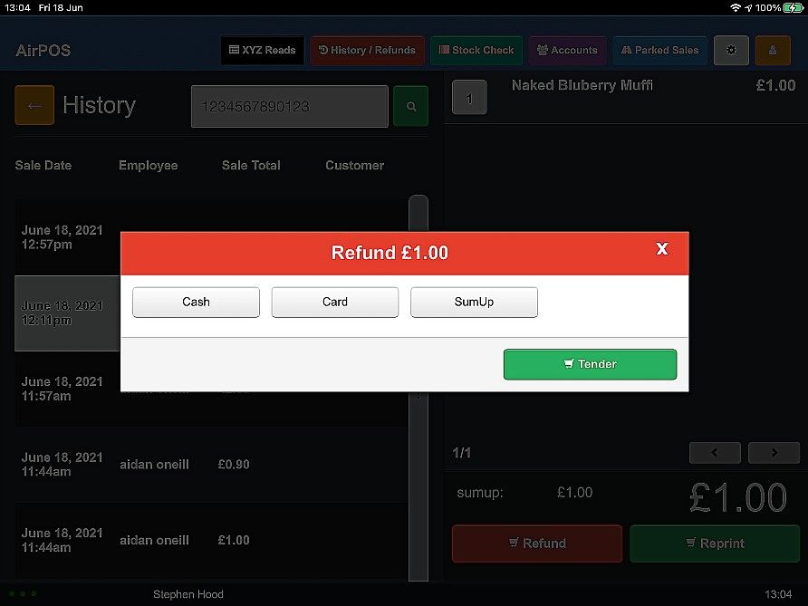 To refund a transaction tendered through SumUp tap on the red 'History / Refund' button at the top of the screen. If the transaction was made within the last 24 hours you will be able to select it from the list of transactions that appear when you press the red 'History / Refund' button otherwise enter the transaction number from your customer's receipt in the search box. If you are refunding an older transaction tap on 'Search' and type the barcode number off the customer's receipt into the search box. The transaction will be found and will appear in the cart.