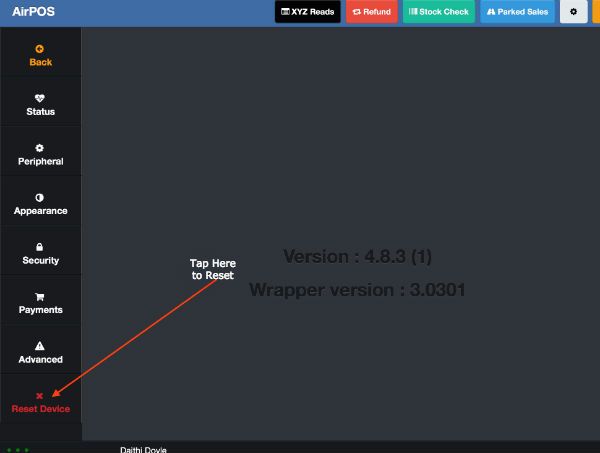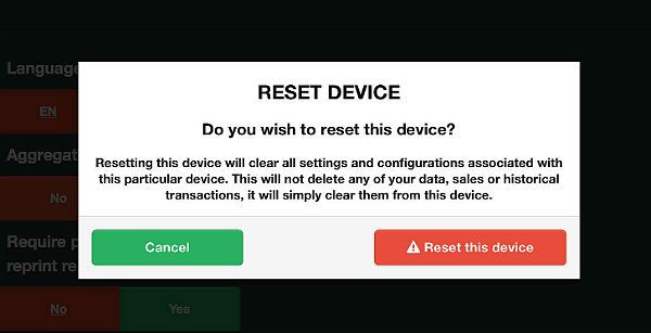 The ‘Reset’ button provides you with the ability to reset your current device safely from AirPOS. To do this simply click ‘reset device’ and the following modal window will give you the option to do so.