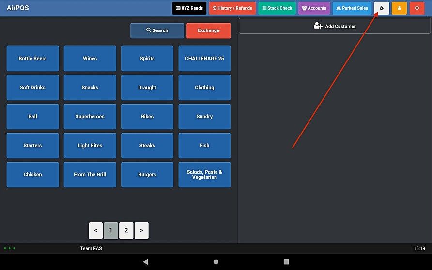 Open the AirPOS application and tap on the settings cogwheel icon at the top of the screen as seen below.