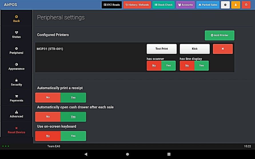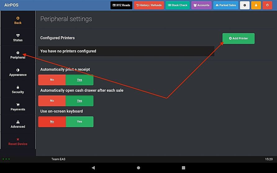 From the menu on the left select 'Peripheral' and press the green 'Add Printer' button icon the 'Configured Printers' screen as seen in the image below.