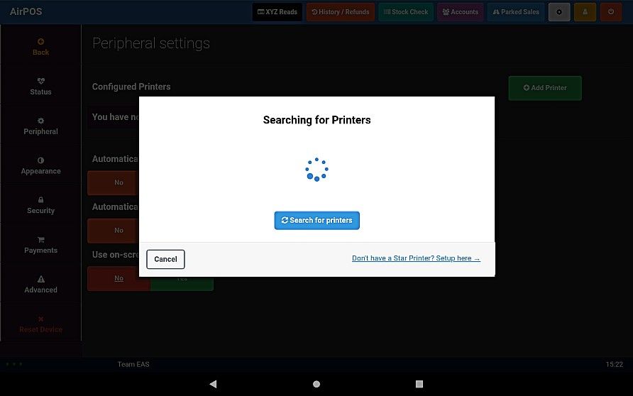 You'll see a screen like that below to show that AirPOS is searching for available Star printers.