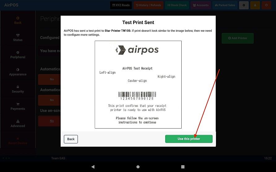 You can see that AirPOS has found one. Tap on the 'Test Print' button beside the printer you want to connect, in this case the MCP31 printer which is shown with it's IP Address. An image of the test print will appear on your screen. If the test print looks similar to the image press the green 'Use this printer' button to save your selections.