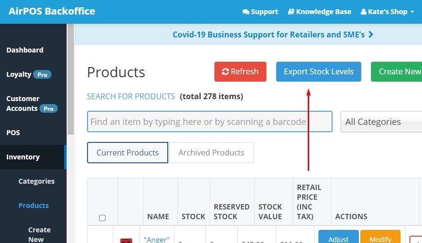 In the Inventory screen at the top right you'll see a button to 'Export Stock Levels'. Tap or click on that button as shown below. The button will change to say 'Generating...'.