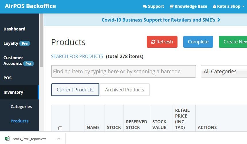 When the report has downloaded the 'Export Stock Levels' button will change to 'Complete' and the downloaded report as a .CSV file will be shown at the bottom left of the screen similar to the image below.