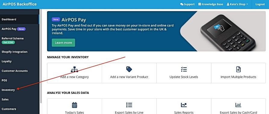 Once logged in to the backoffice click or tap on 'Inventory' from the left margin as shown below.