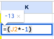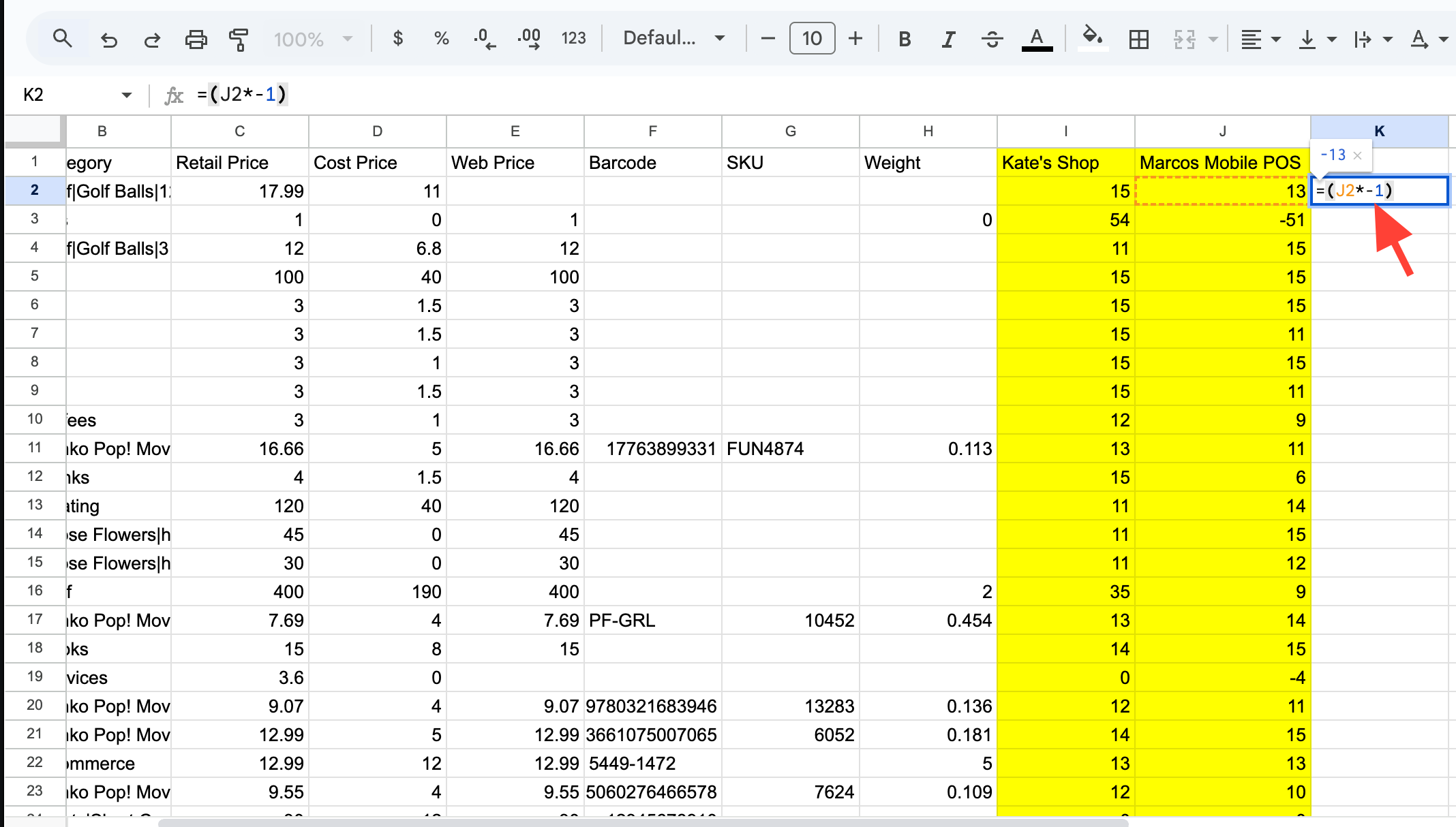 If you want the stock at a particular location set to zero this is done by creating an input file with the inverse values from the stock level report. In the example above if we wanted to create a file to set the stock quantities at 'Marcos Mobile POS' to zero this can be done by inserting a column to the right of column 'J' and in the second cell type the formula =(J2*-1) as shown below.