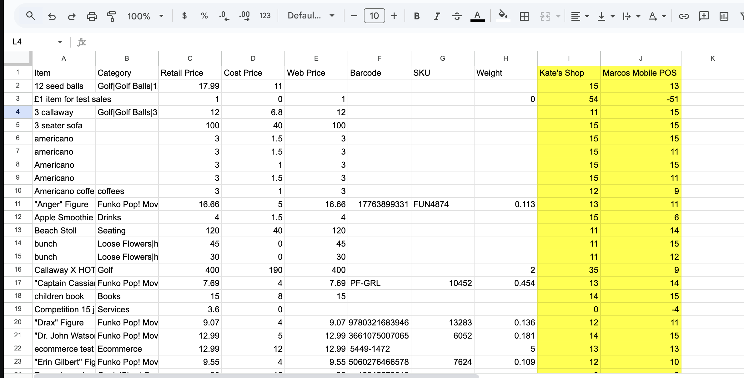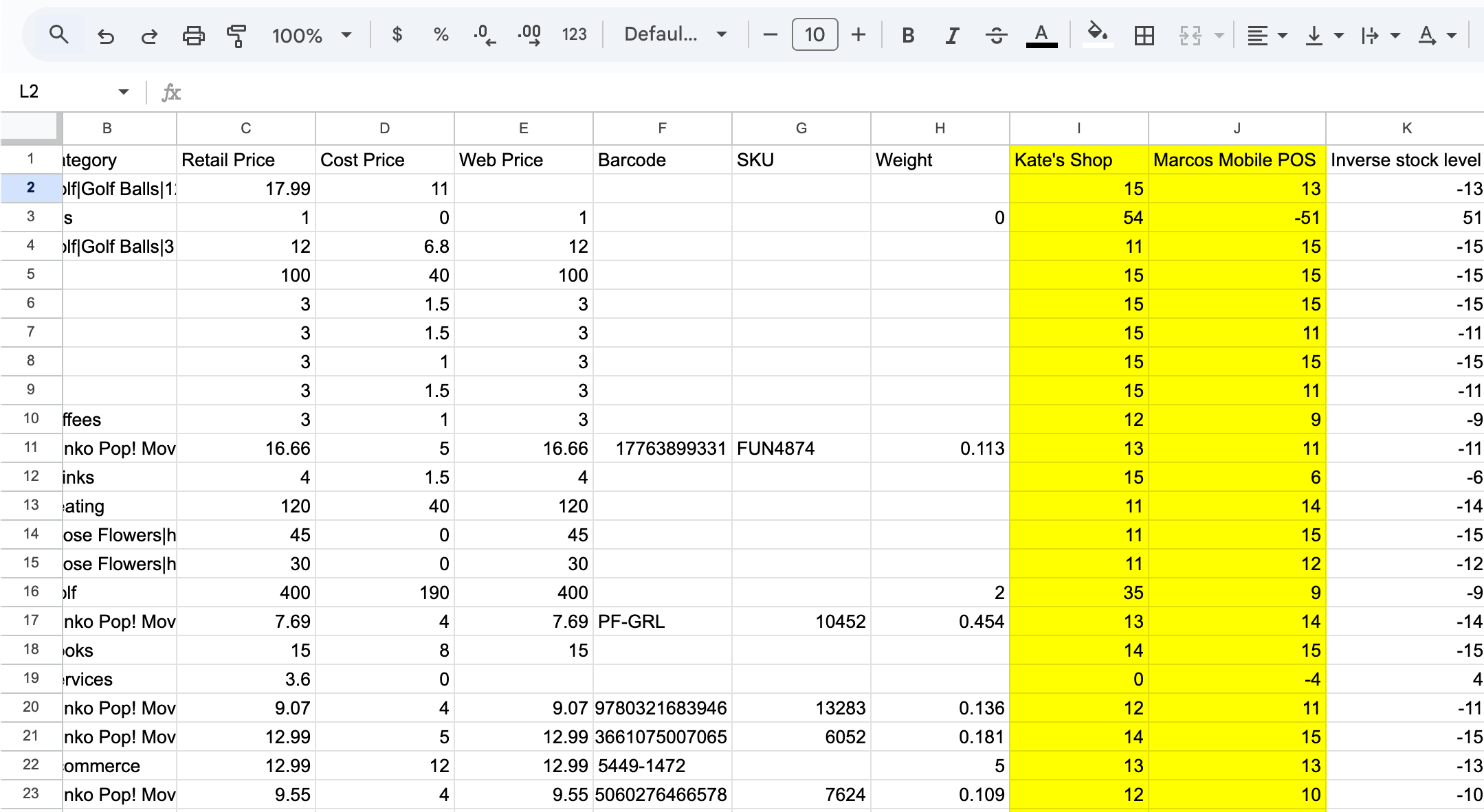 Once complete you can open this file with any spreadsheet software. The report will show various aspects of your products such as name, price, category etc. It will also show the stock held at each location for each product as shown in the highlighted columns in the example below.