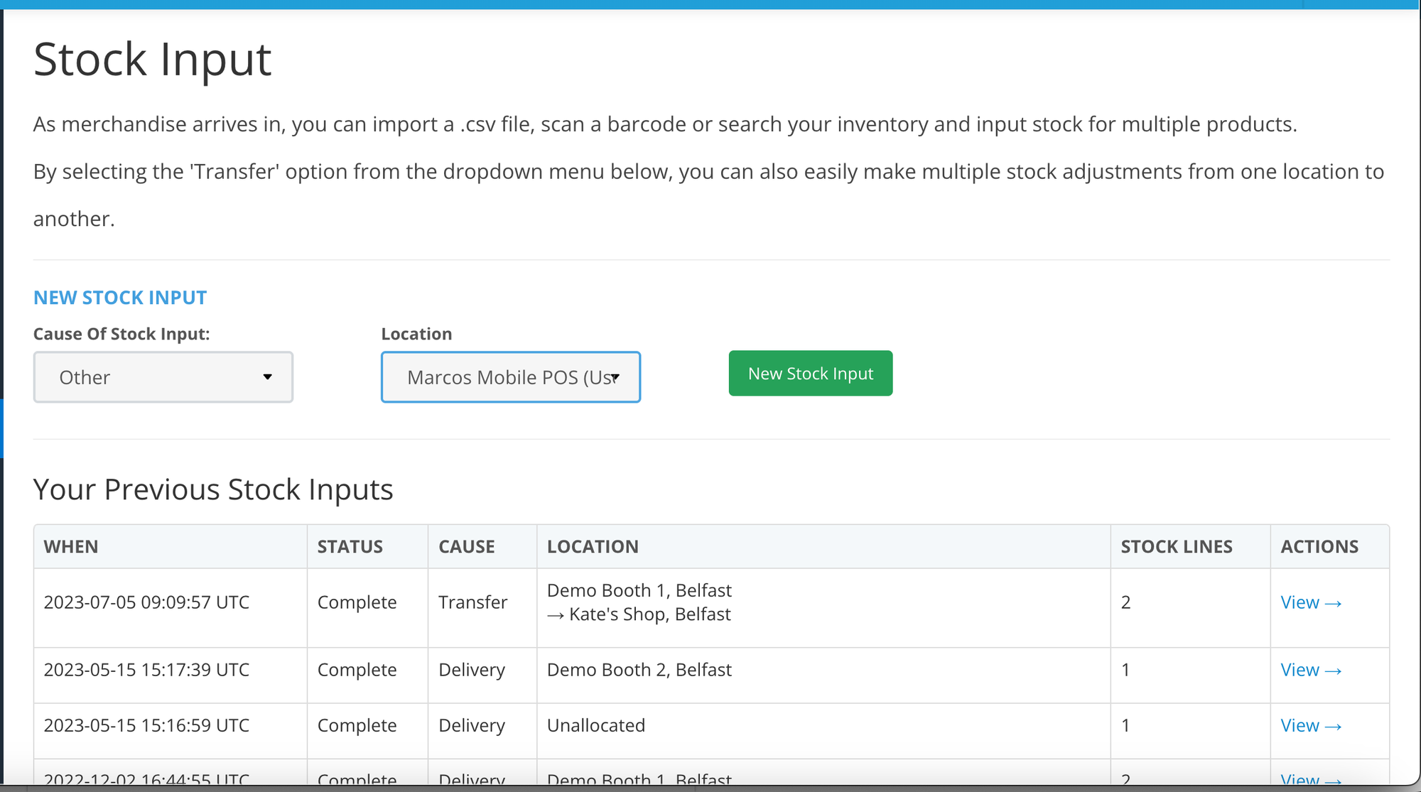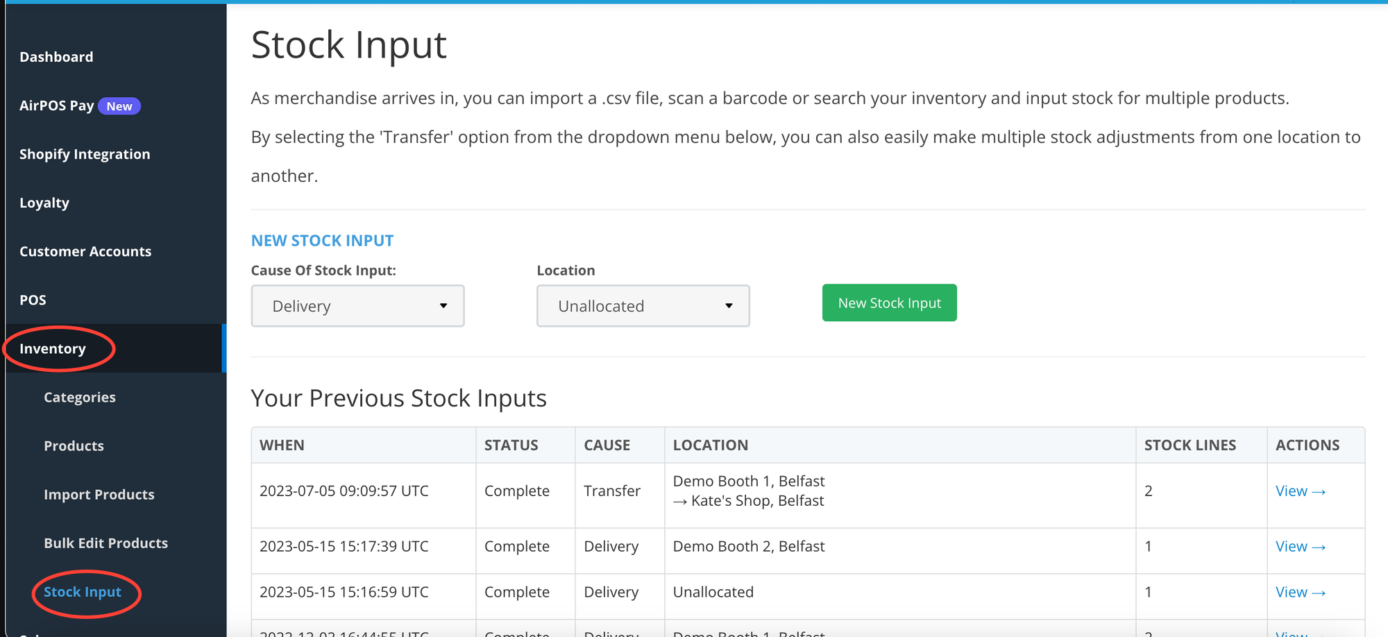 When your file is ready to upload go to the 'Stock Input' screen which is found by clicking or tapping on 'Inventory' from the navigation menu in the Backoffice and selecting 'Stock Input'.
