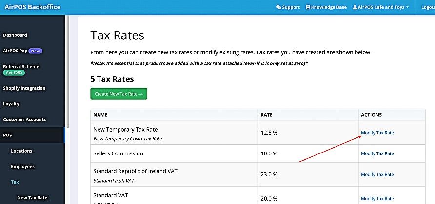 To do this go to your account backoffice and select 'POS' from the menu on the left. Select 'Tax'. All of your tax rates will be displayed. Click or tap on the 'Modify Tax Rate' link to the right of the temporary tax rate.
