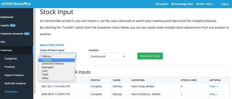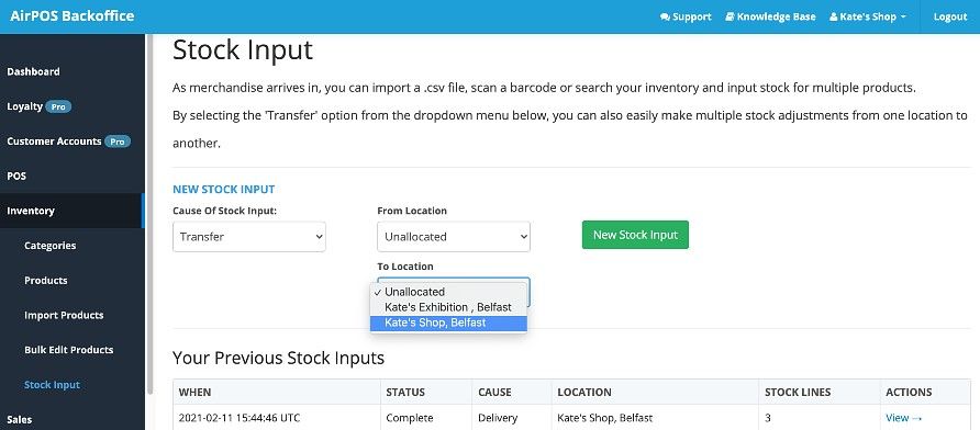 Having selected the locations you wish to transfer stock between (unallocated to Kate's Shop) press the green 'New Stock Input' button. You'll see a screen similar to the image below.