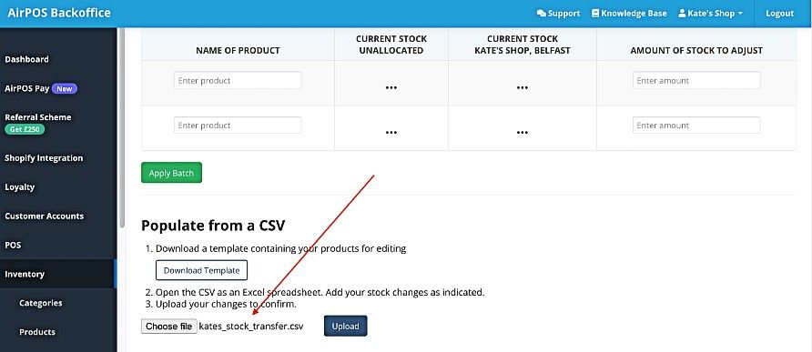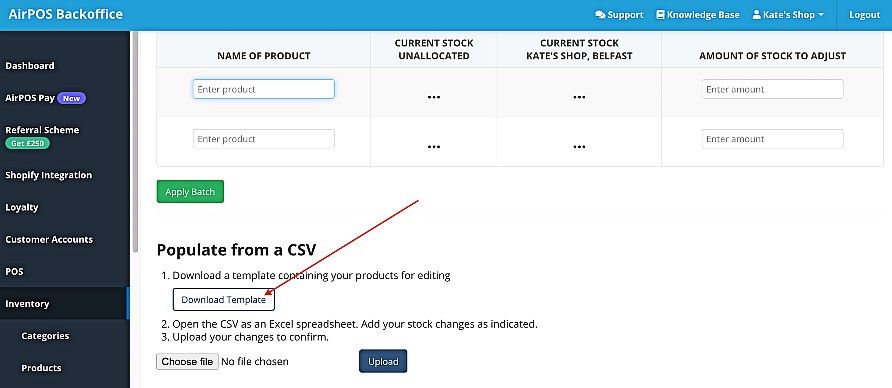 You can do this for each product or you can use our template to do this for all the stock of your products that is unallocated. To do that click on the 'Download Template' button indicated above. When you open the file enter the number from the unallocated column in your stock level file for each product into the corresponding cell in the 'Quantity (+/-)' column of the template file. When you have completed that save the file as a .CSV.