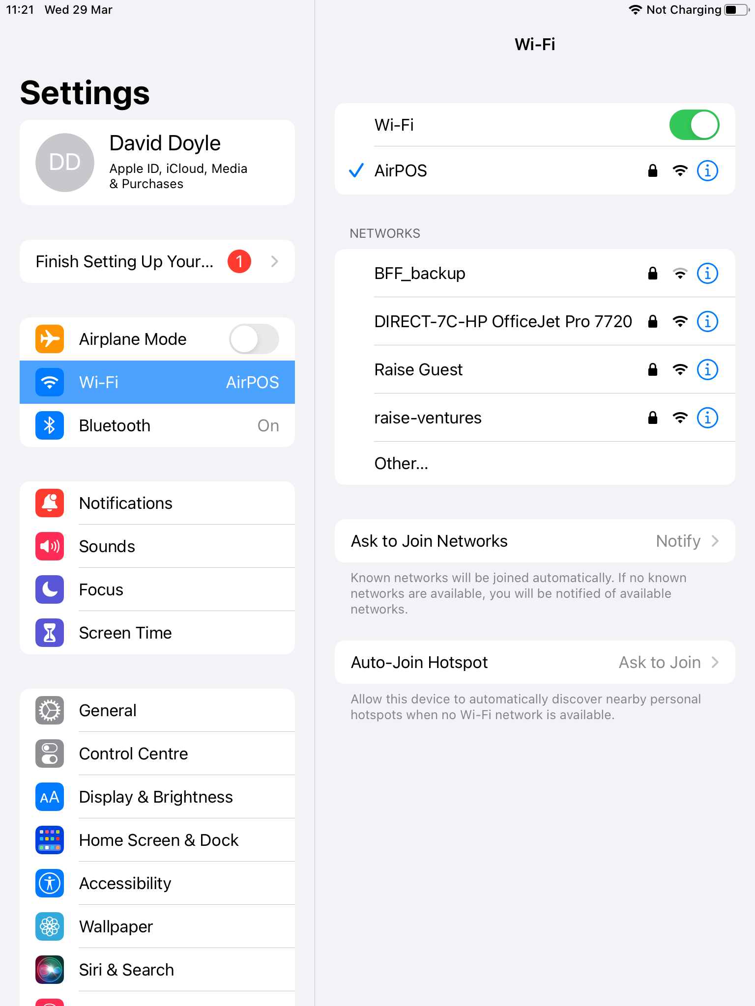 If you have an IOS device, navigate to the settings page by tapping in the 'Cogwheel Icon' which you will find amongst your apps. From there, tap on the option named 'Wi-Fi' You'll see the current network and other possible connections. If you're on the wrong network, tap on the one you want to use and enter the unique password.