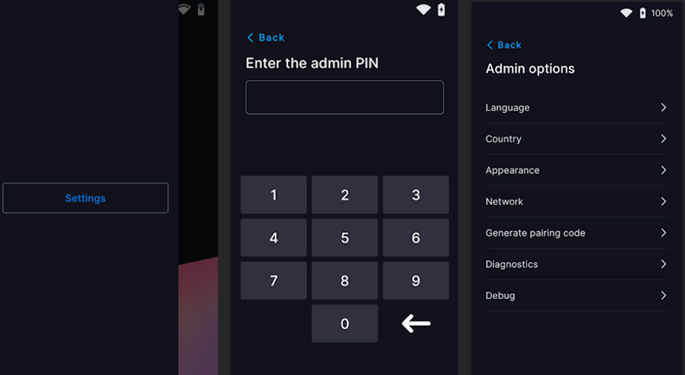 Now, let's check the network connection on your WisePOS E Reader. Swipe towards the right from the left edge of the reader screen to bring up the Settings button, and enter the admin PIN 07139. From there, tap on 'Network' to see which network the reader is currently on. Make sure it's the same as the one on your POS device.
